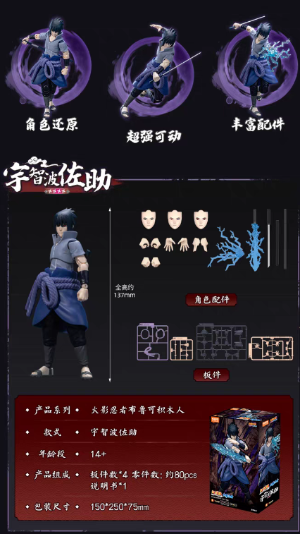 布鲁可ブロック NARUTO -ナルト- 疾風伝 うちはサスケ アクションフィギュア 未組立 海外限定 SB78009D